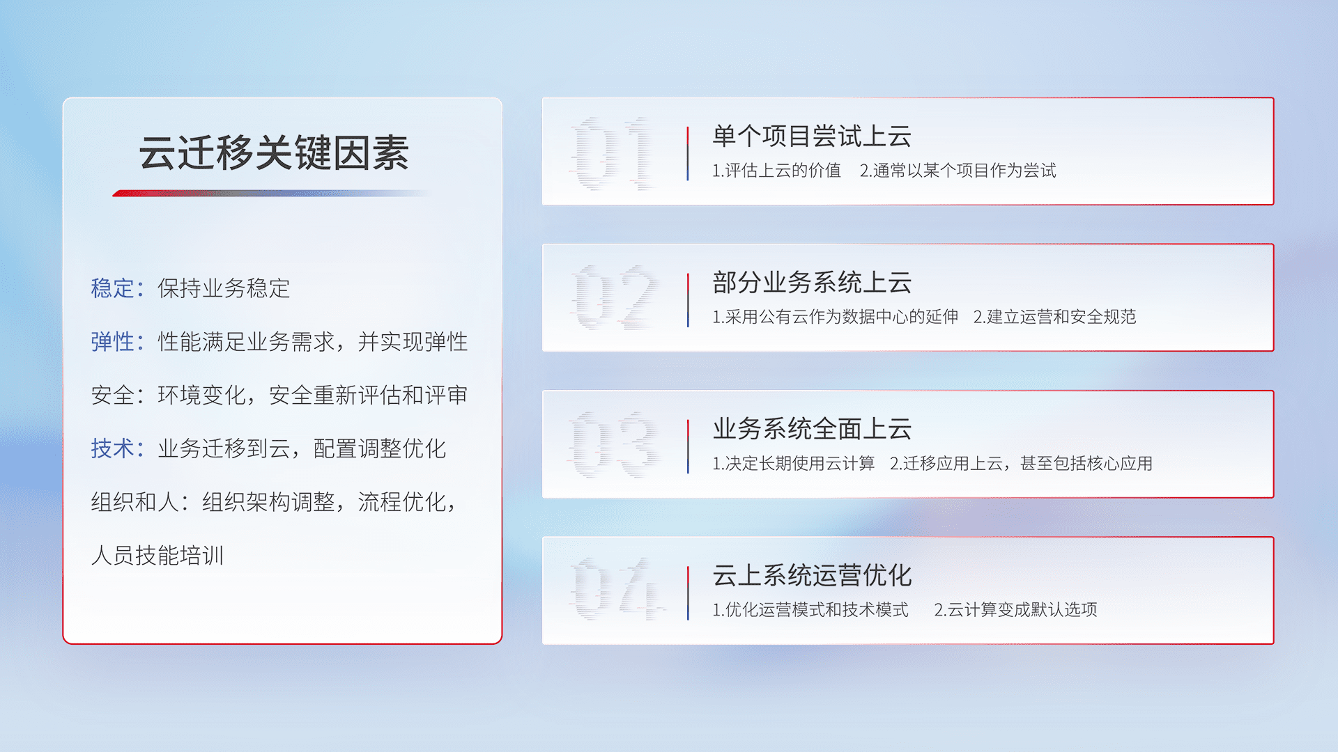 结合实际业务,,,,从规划设计、、、、云平台选型、、、、云原生改造、、、、数据迁移、、、集成交付,,迁移全过程为客户识别最佳上云路径,,,,做好风险识别管理,,,设计网络架构、、、、身份权限、、、安全审计合规、、、操作审计、、、、日志审计、、、监控告警策略、、、、多站点容灾设计等,,,,对云上基础设施进行整体规划,,提升IT治理水平,,以满足弹性、、高可用、、、、高性能的需求。。